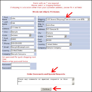 Step 8: Billing / shipping information and comments Simply type in your credit card information on the left and if your going to be shipping to a different address put that in on the right side. For international shipping or expedited shipping please change the shipping method in the top right corner. There is also a comments box for any special requests. When everything is complete on this page you will then click on the "Continue" button.