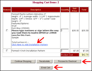 Step 7: Patterns, email cart, or checkout If you choose stud mounting there will be a link to add Installation patterns. Click on that link and it will add in the patterns to your cart. Next on this screen you will choose to either "Proceed to Checkout" to begin putting in your shipping and billing information or "Email Cart "this cart to someone for checkout.