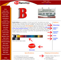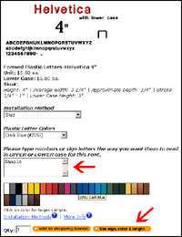 Step 5: Select letter color & Installation method Place your mouse over some of the colors and notice that the color name and number will appear. When you find the color you are interested in simply click on it for a larger image. Then select this color in the options box as noted in the picture above. Here is a link to detailed descriptions of all of our Installation patterns.