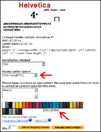 Step 5: Select letter color & Installation method Place your mouse over some of the colors and notice that the color name and number will appear. When you find the color you are interested in simply click on it for a larger image. Then select this color in the options box as noted in the picture above. Here is a link to detailed descriptions of all of our Installation patterns.