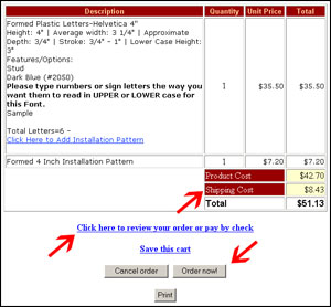Step 6: Type in text and add to shopping cart The next step is to type in the letters and numbers exactly how you want your sign to read, some fonts will only be available in upper case. After you have typed in your text you can preview your sign by clicking on the "See sign, color & length" button as noted on the picture above or click "Add to shopping basket" to begin checking out.